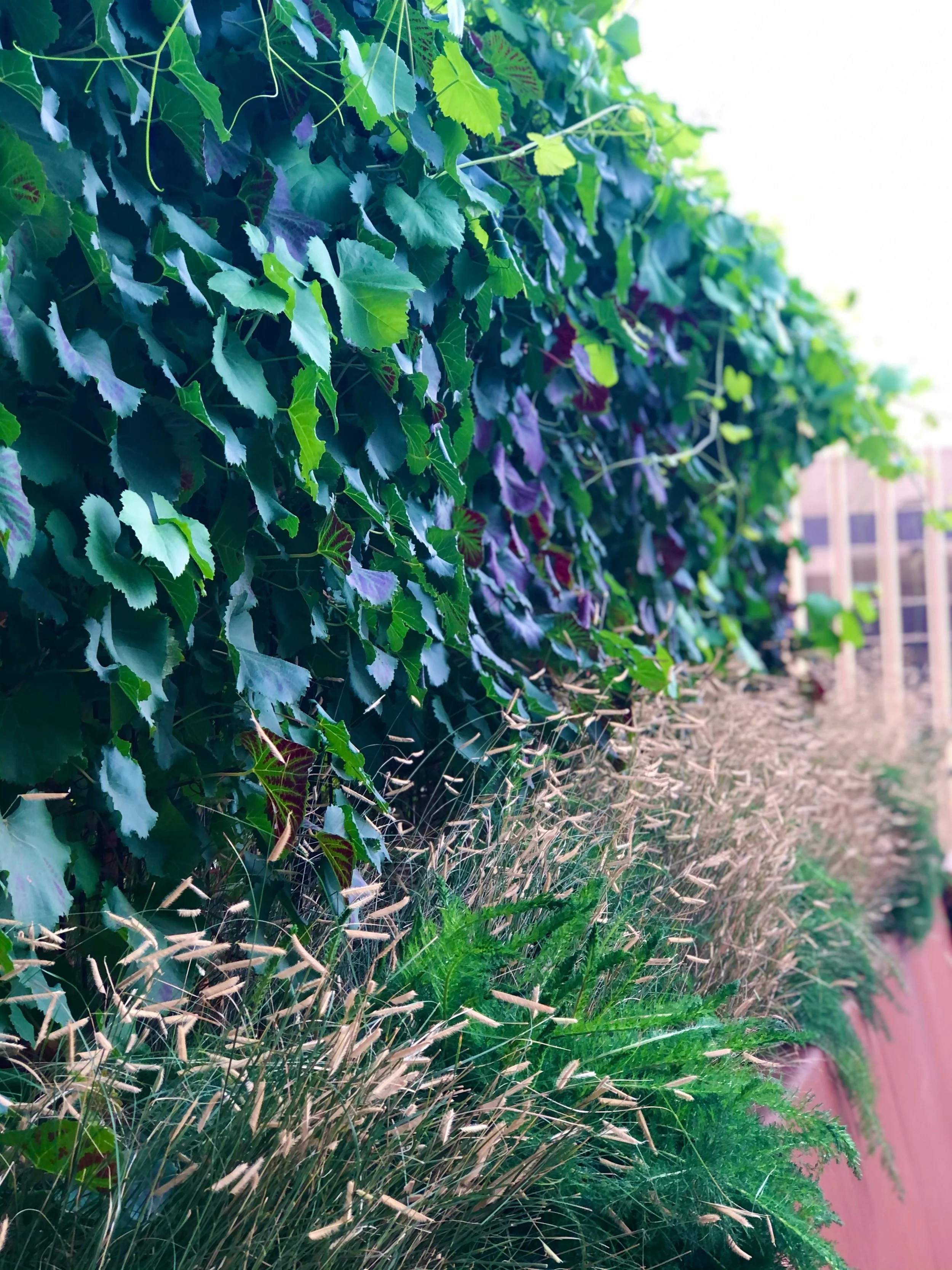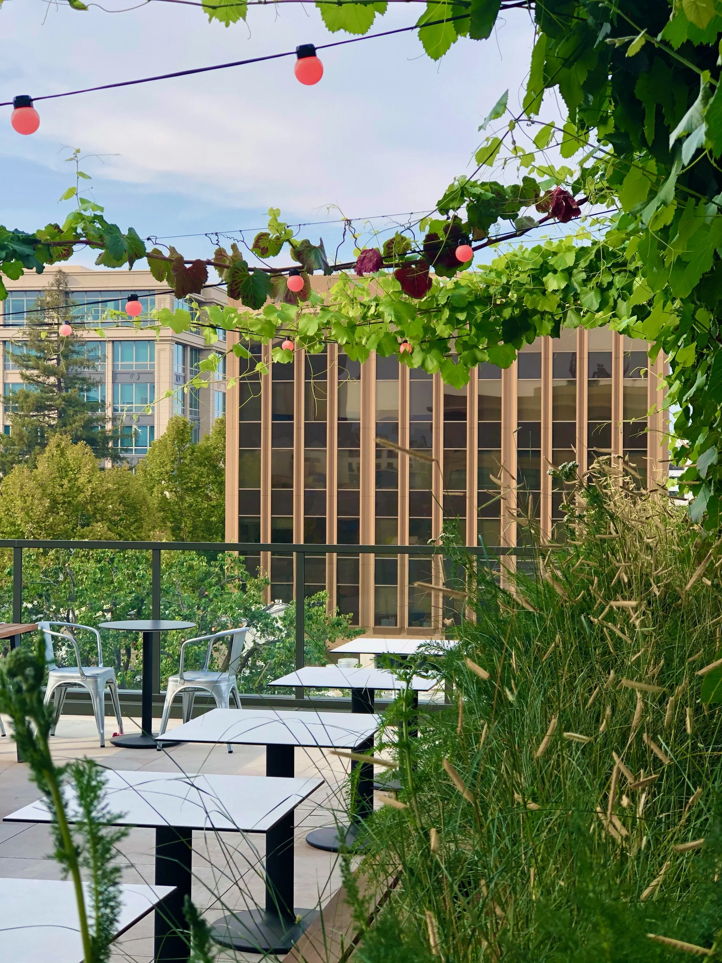 This third floor roof terrace serves as an outdoor lounge and dining area for this headquarters for CZI in the middle of a downtown area. It provides both a refuge from and a vantage point to the urban scene as it unfolds two floors below. Custom planters define a casual “firepit” type area. Linear Corten planters w/vine trellis screens define and separate an adjacent dining area. Finally a “kitchen garden” featuring edible plants provides a setting for small group lounging and meeting.